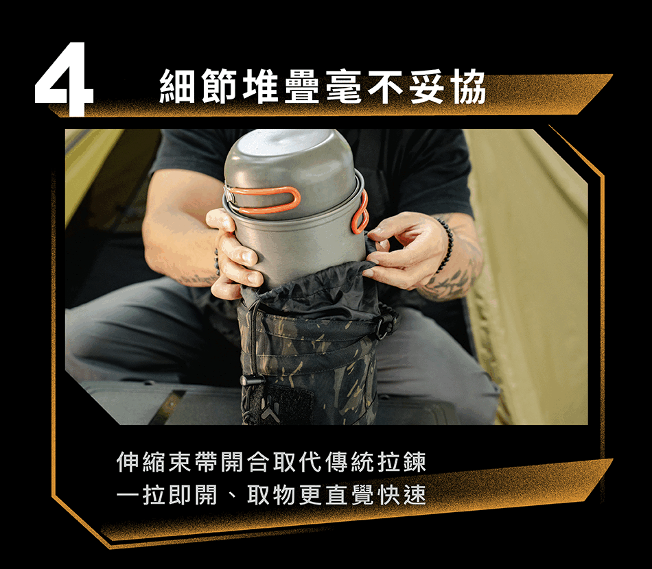 ▸ 便捷取物|伸縮束帶大開口,一拉即開、一束即走