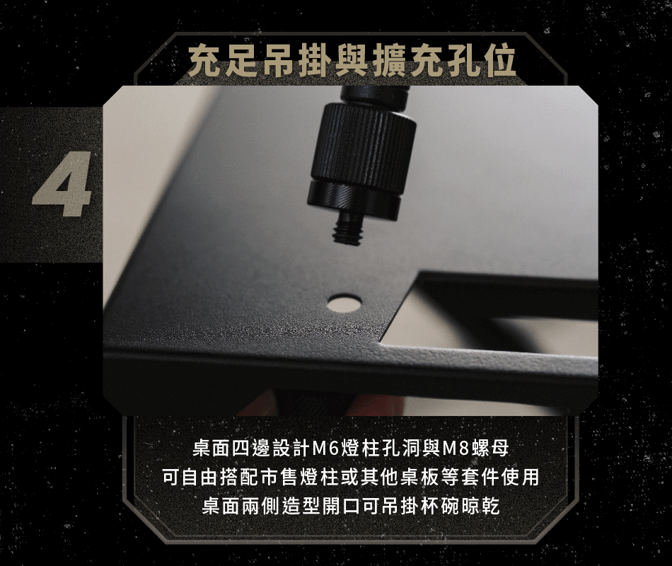 ▸ 多元配置|充足吊掛與1/4&M8擴充孔位